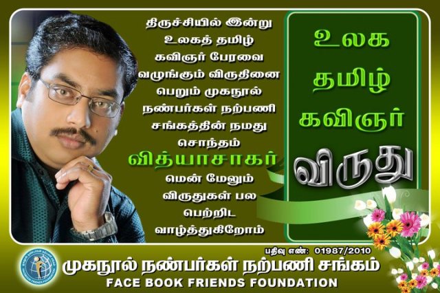 அன்பு சகோதரன் வித்யாசாகருக்கு கிடைத்திருக்கும் இவ்விருது அவருடைய வெற்றி வாழ்க்கையில் மேலும் ஒரு படிக்கல்லே..இன்னும் மென் மேலும் விருதுகள் பல பெற்றிட முகநூல் நண்பர்கள் நற்பணி சங்கத்தின் சார்பில் வாழ்த்தி மகிழ்கின்றேன்…..