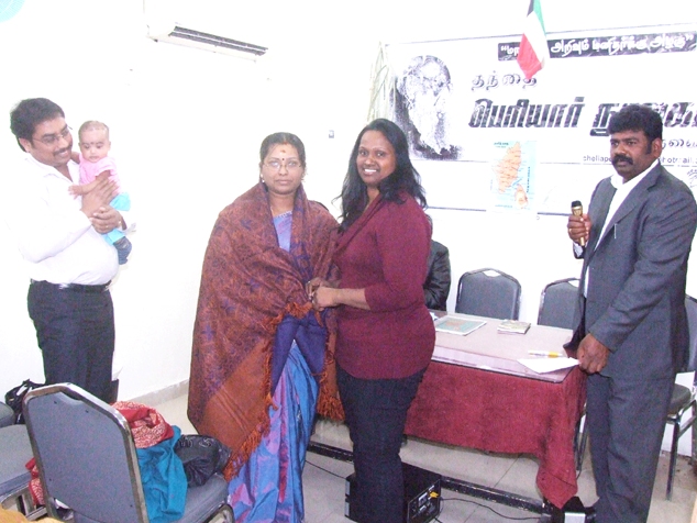 அது தொடர்ந்து, பெரியார் பன்னாட்டு கழக செயலார் திருமதி. கவிதாயினி சொப்னபாரதி லதாராணி அவர்கள் ‘குடும்பம் எனும் கோப்பில் உள்ள ஒருவரின் வெற்றிக்கு இருவரின் செயல்பாடுகளும் காரணம் என்பதை வலியுறுத்தும் வகையில் செல்லம்மாவிற்கும் பொன்னாடை அணிவித்து மரியாதை செய்து எங்களை மகிழ்ச்சிக் கடலில் ஆழ்த்தினார்.