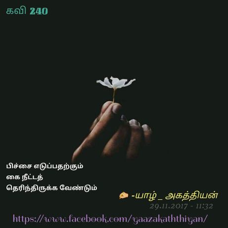 நம் முந்தைய காலத்து வாழ்வமைப்புகள் இதற்கெல்லாம் வெகுதூரத்தில் நிற்பதுபோல் மிகுந்த அன்பும் கூட்டுறவுகளின் கூடாரமாகவும், நட்பும் காதலும் பெருகியுந்தான் இருந்திருக்கிறது. நட்பென்றால் எதிர்ப்பார்ப்பின்றி உயிருள்ளவரை நட்பென்றே அறிப்பட்ட காலமும் சூழலும் அன்றில் இருப்பதை நாம் நமது வரலாற்று வழியே காண்கிறோம். அக்காலத்தே துறவு என்பதே அவசியப்படாதிருந்ததை கேட்டிருக்கிறேன். ஆசையை, எதிர்பார்ப்புகளை விட்டு விலகி இருத்தல் வீட்டிற்குள் நிகழ்கையில் தனியே துறவறம் ஏற்பதென்பது அவசியமற்றுப் போயிருந்த காலமது. வீட்டிற்குள்ளே இருந்துக்கொண்டே வெளிவாழ்க்கையை உதறிவிடுவதும், உண்ணும் உணவை மருந்தாய் உண்டதும், ருசியை துறந்து பலர் பசிக்காய் வாழ்ந்ததுமென நம் பெரியோர்கள் அக்காலத்தே இல்லறத்தை கோயிலாகயெண்ணி அமைதி பூண்டு வாழ்ந்ததையெல்லாம் கண்டிராத மக்களில்லை நாம். இன்று வாழ்க்கை வேறு. உறங்கி விழித்து பல்துலக்கும் பற்பசையில் இருந்து இரவில் உறங்க பயன்படுத்தும் மெத்தை வரையொரு வியாபார அரசியலும், விற்பனைத் தந்திரமும், சுயநல ஆசைகளும் பெருகிநிற்பதை அறிகிறோம். அவைகளையெல்லாம் உதறிவிட எதிர்பார்ப்பின்றி வாழப் பழகுவோம். சுயநலமறுத்த நெஞ்சு நமை பொதுநலத்தில் கொண்டுசேர்க்கும். அங்கே பிறர் பசிக்கும் சேர்த்துச் சொட்டும் வியர்வையால் நம் எதிர்கால தலைமுறை பஞ்சமொழிந்து ஆனந்த வாழ்க்கை வாழ்கையில் அங்கே எல்லோருக்குமான சமத்துவமும், எல்லைக் கோடுகளற்ற உயர்ந்த விடுதலையும் சரிசமமாய் எல்லோருக்கும் கிடைக்கும் என்பதை ஒரு சின்ன கவிதயினுள் புகுத்தி எழுத்திற்கு அழகு சேர்க்கிறார் கவிஞர் திரு. யாழ் அகத்தியன். அவருக்கு எனது மனமார்ந்த நன்றி. தமிழ்கூறும் நல்லுலகிற்கு அவரால் மேலும் பல சிறந்த படைப்புகள் கிடைக்கட்டும், எழுதினால் அவரது புகழ் ஓங்கி மண்ணில் நிலைத்திருக்கட்டுமென வாழ்த்தி, கவிதைக்கான வாசலை நோக்கி வரவேற்றவனாய் விடைகொள்கிறேன்.
